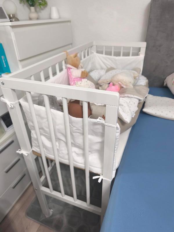 - MAßE: Das Babybett mit Rausfallschutz hat eine Breite von 40 cm, eine Höhe von 96 cm und eine Tiefe von 90 cm. Alle detaillierten Größen sind auf den Fotos angegeben.