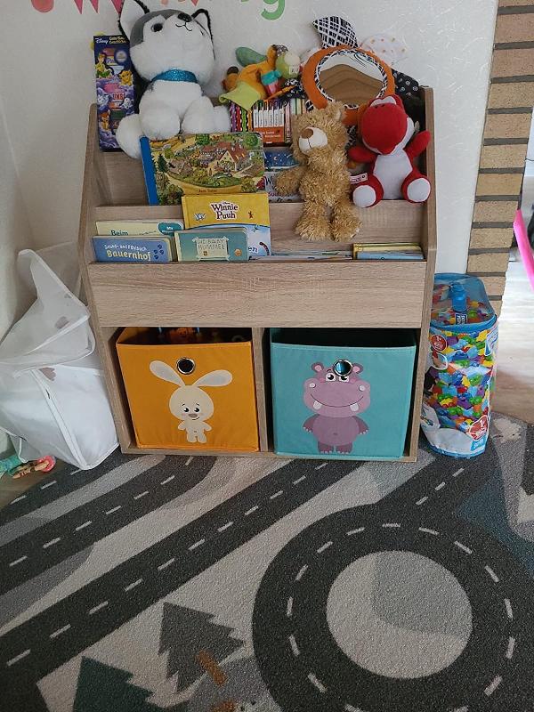 - Die Regalbox für Kinder ist abwaschbar und mit einer Öse ausgestattet, durch die ein Finger leicht herausgezogen werden kann. Auf den Boxen sind bunte Kinderfiguren gemalt.