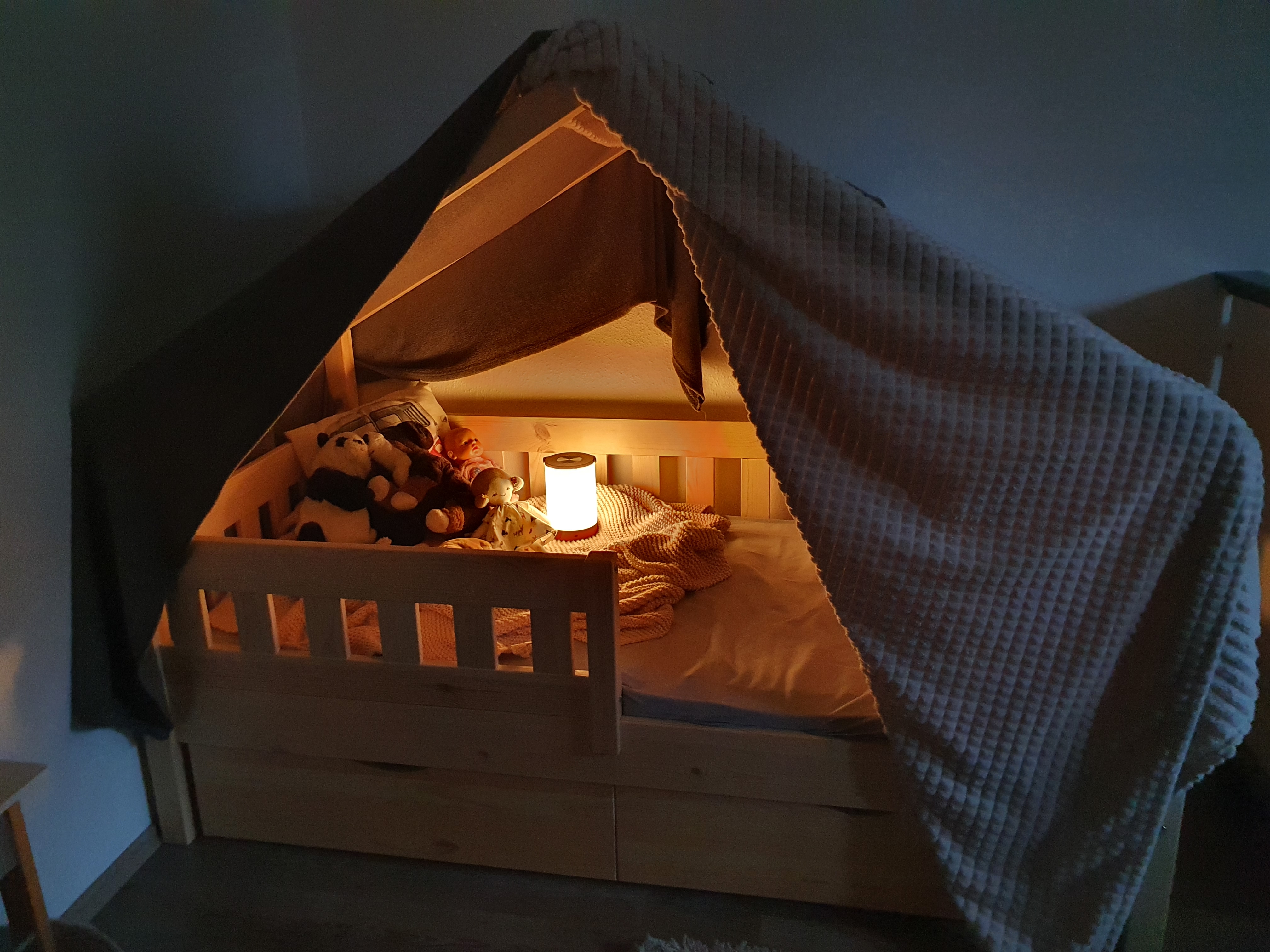 » Dieses Bett ist nicht nur toll zum Schlafen. Meine Kinder lieben es damit Buden zu bauen, weil es so einfach ist die Decken darüber zu legen. Es wird im Bett gekuschelt, gelesen und sicher geschlafen Dank des Fallschutzes.