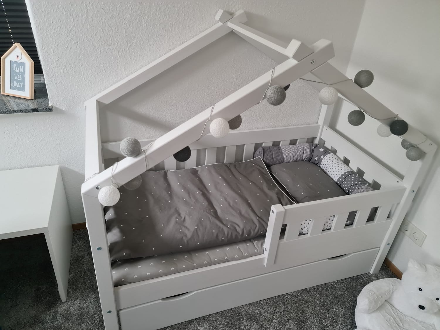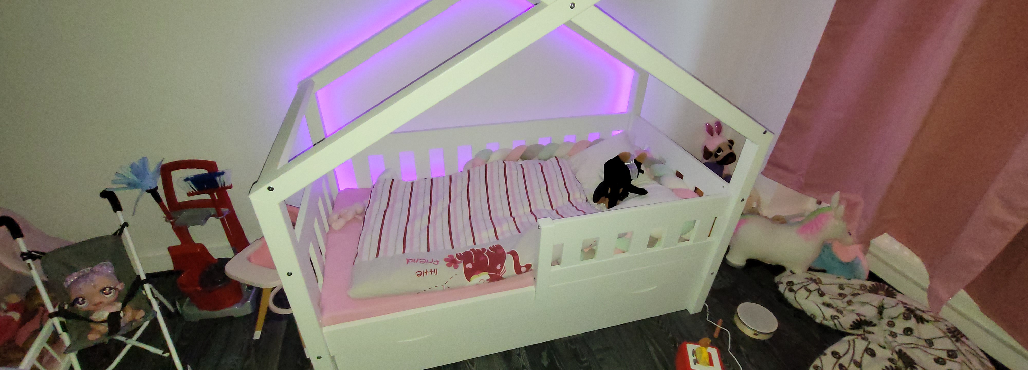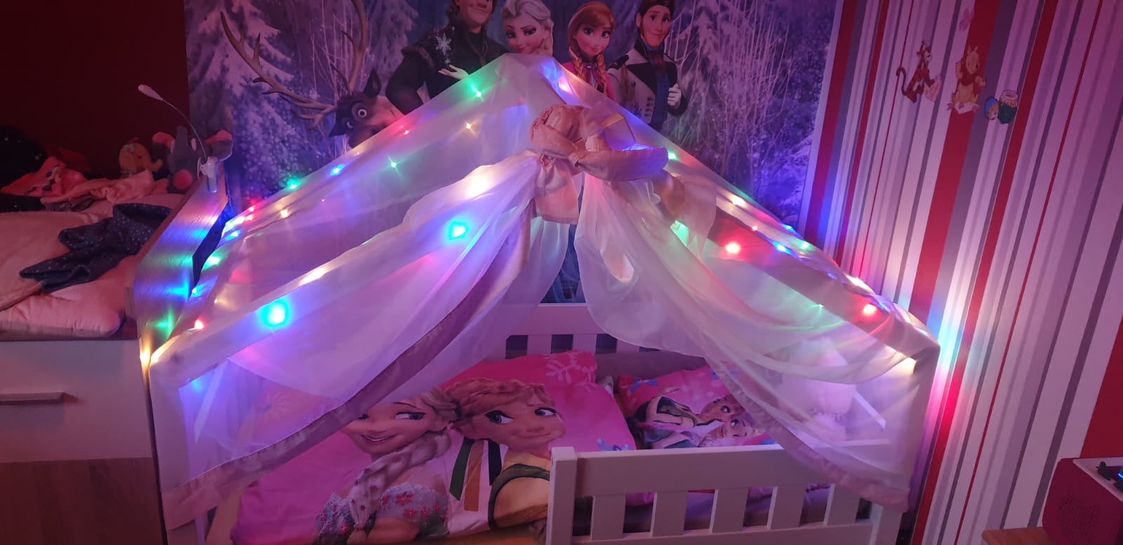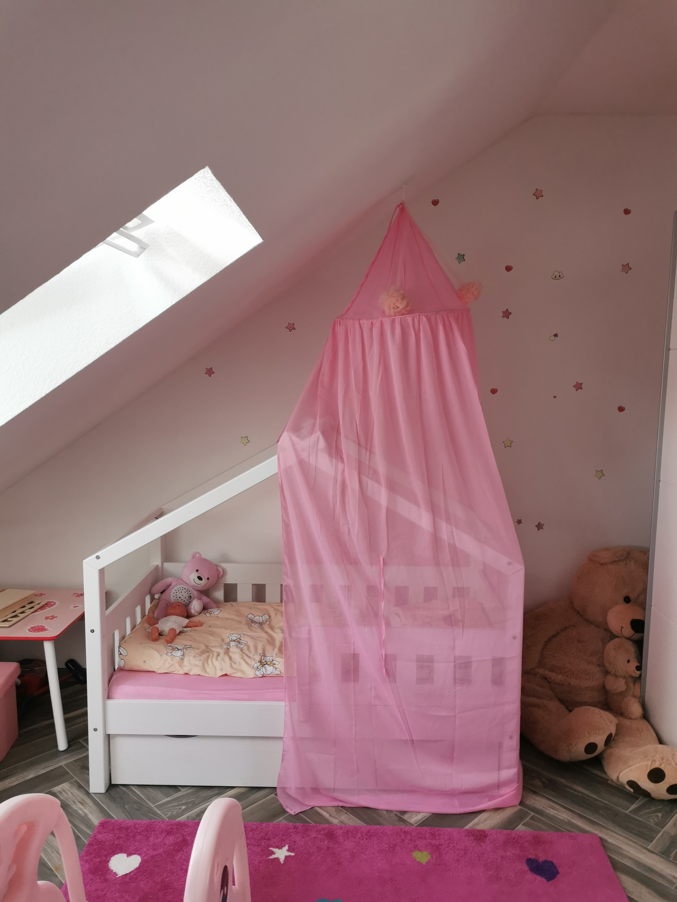 PS: um das ganze zu verschönern und es dem Kind gemütlich wie möglich zu machen, haben wir eine Lichterkette und den Rosa Betthimmel gekauft!