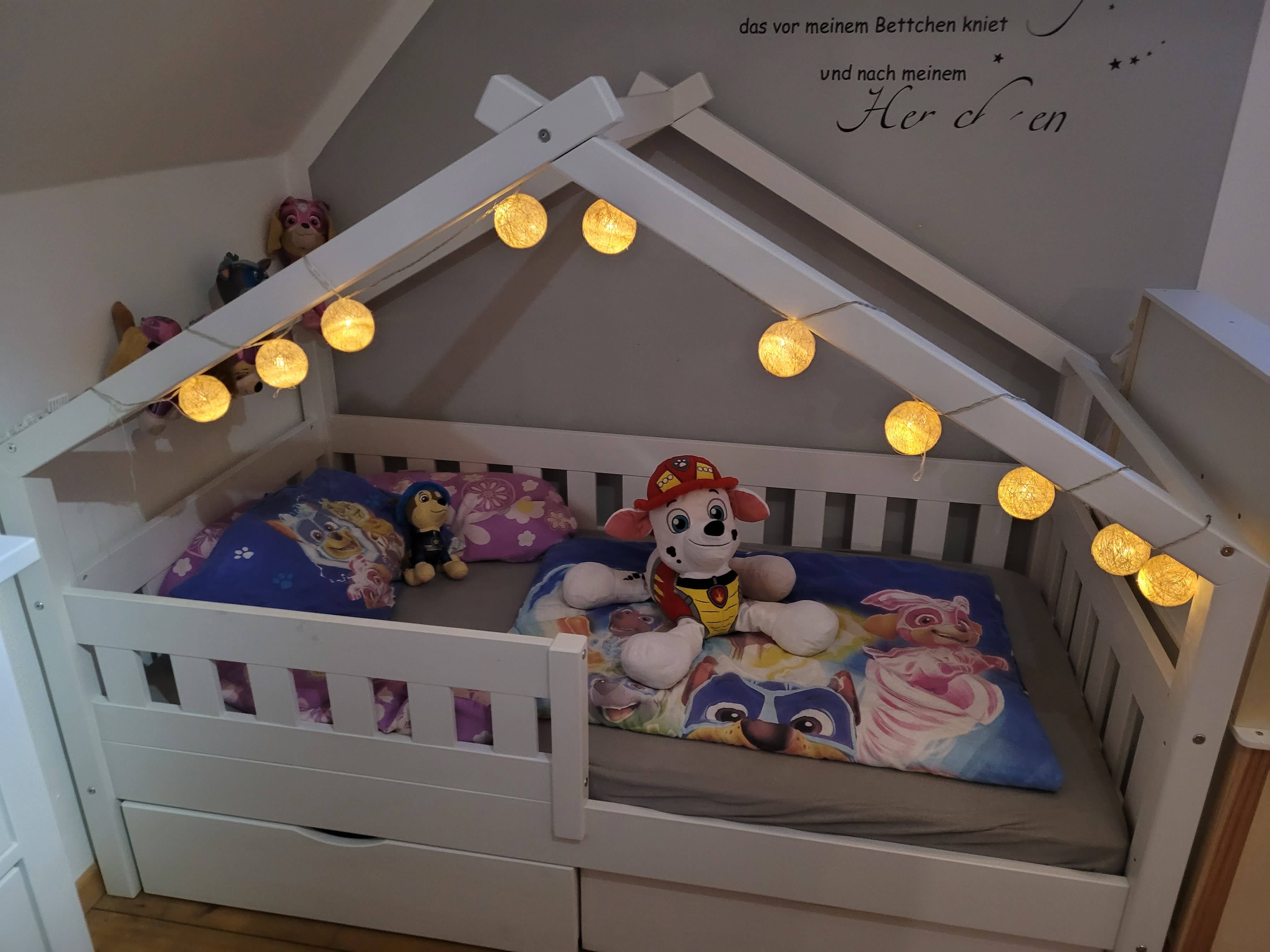 Es passt perfekt in die Ecke im Kinderzimmer mit Schräge und mein Sohn liebt es darin mit seinen Paw Patrol Hunden zu kuscheln und zu schlafen. Perfekt sind auch die dazugehörigen Schubladen unterm Bett, welche viel Stauraum bieten 😎