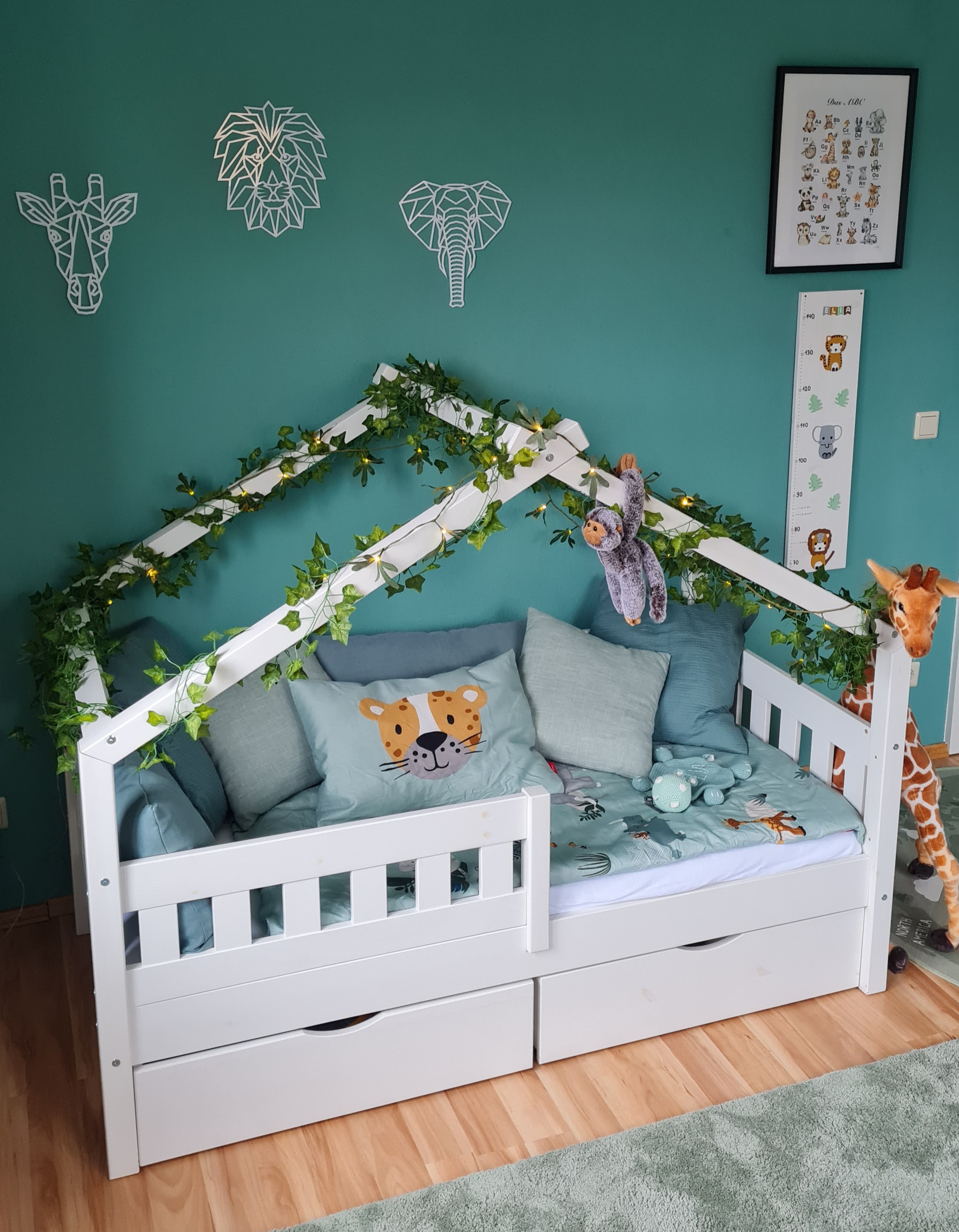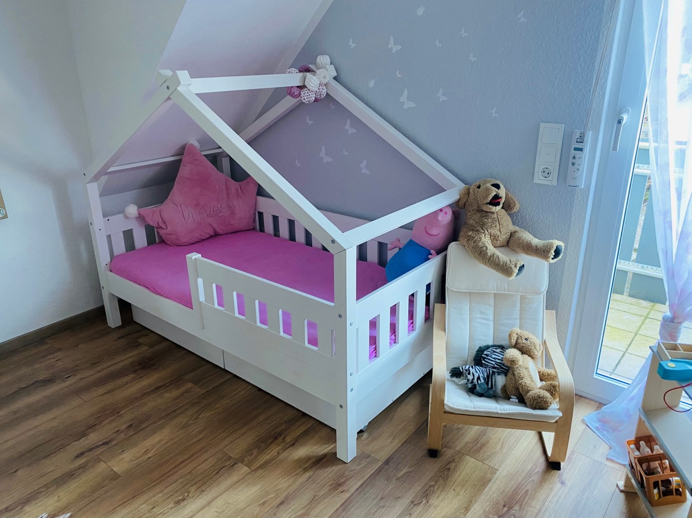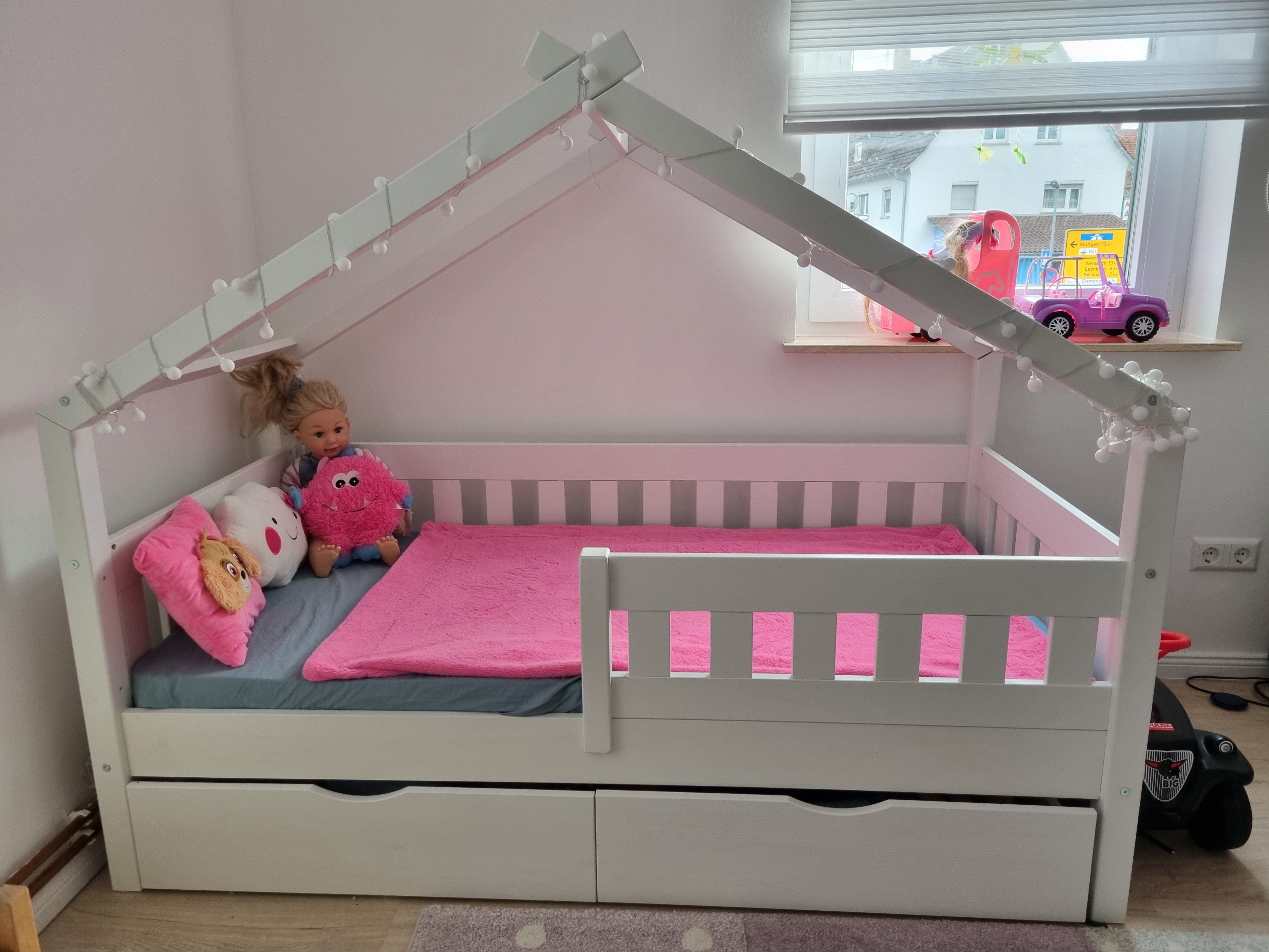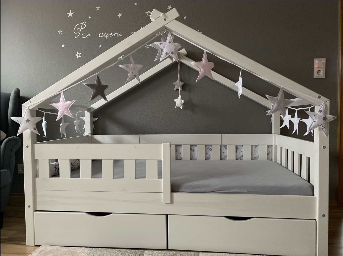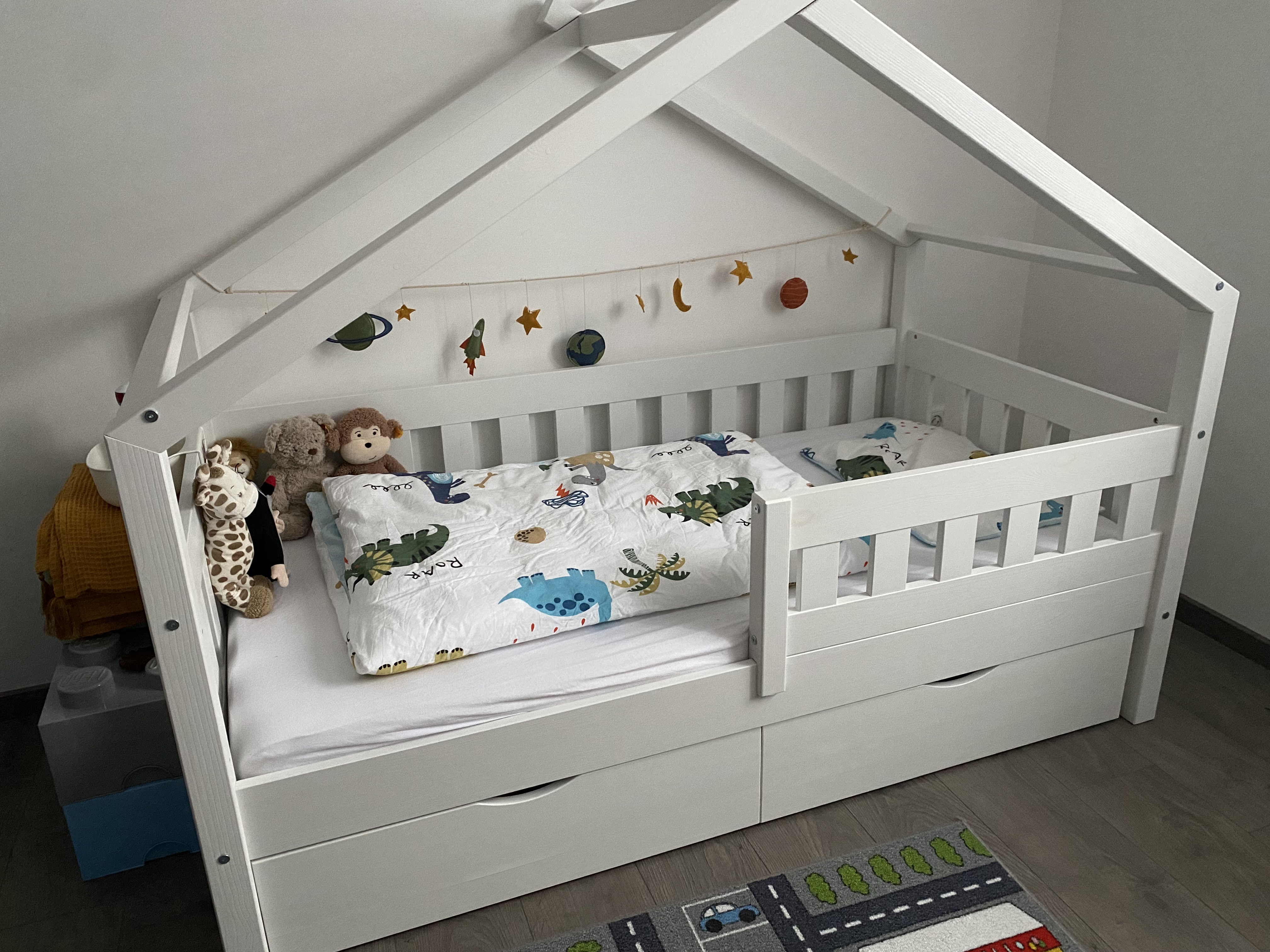 Wir finden die Schubladen darunter perfekt zum Verstauen von Spielzeug. Der Rausfallschutz ist ebenfalls super für die ersten Nächte alleine von unserem kleinen Schatz.