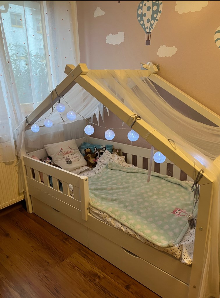 » Unser Sohn, aber auch wir, lieben dieses Bett. Seitdem wir es haben, ist das zu Bett gehen ein reines Vergnügen. Unser Sohn liebt es in sein eigenes kleines Haus zu gehen, indem wir noch gemeinsam den Tag Revue passieren lassen & Gute Nacht Geschichten lesen - wir als Eltern können uns nämlich ebenfalls wunderbar dazu legen. Von uns aus ist das Bett auf jedenfall eine klare Kaufempfehlung! :)