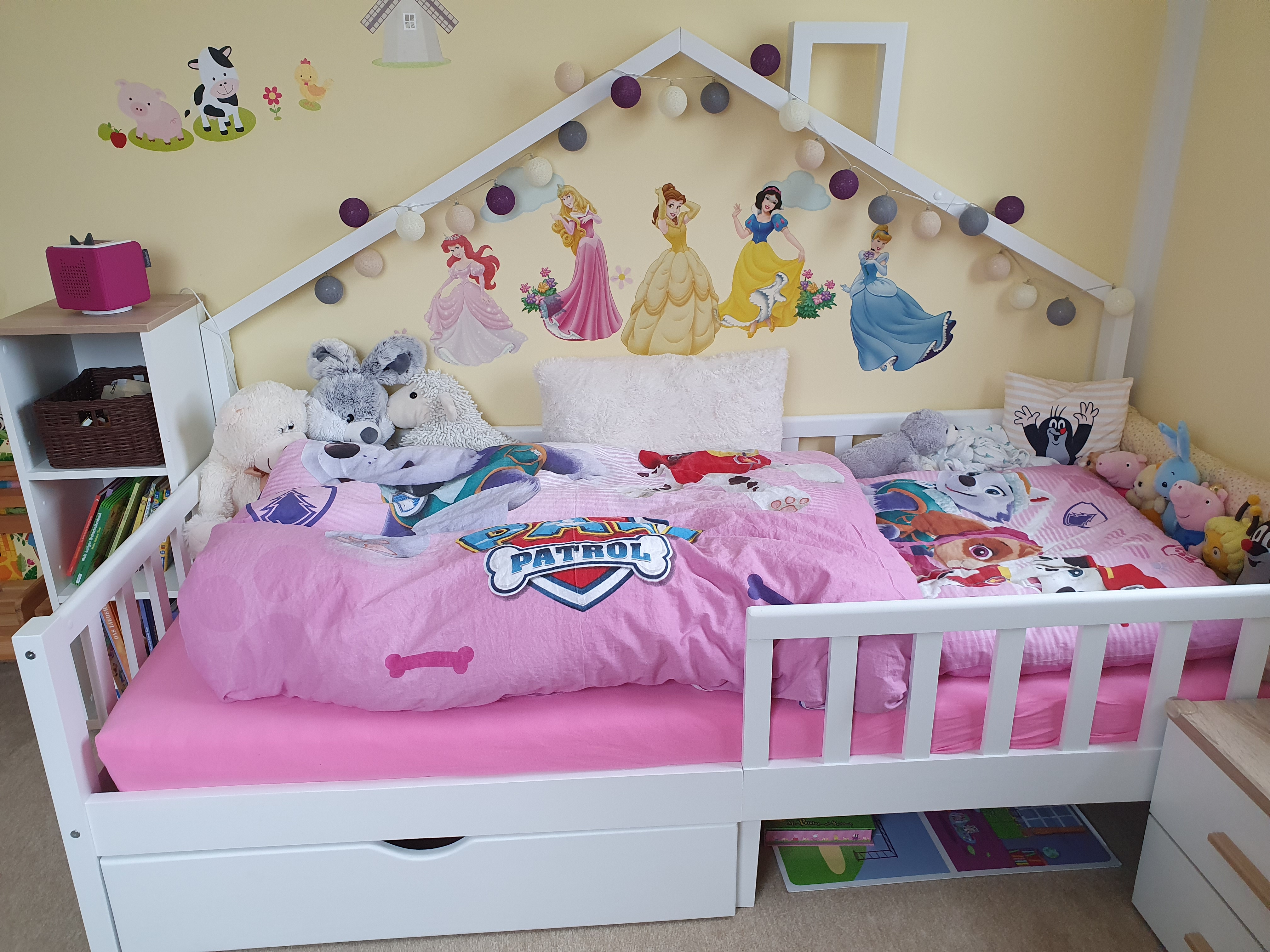 » Unsere Tochter liebt dieses Bett und schläft sehr gut darin. Da das Dach nur auf einer Seite ist, kann man sich nicht den Kopf stoßen und kann es zusätzlich für eine schöne Lichterkette nutzen. Außerdem gibt es so kein Problem mit dem Fenster an der kurzen Seite des Bettes. Die Farbe passt toll zu allem anderen und der Rausfallschutz garantiert, dass auch Mamas oder Papas nicht rausfallen können, wenn sie sich mal mit einkuscheln 😊 Der geteilte Bettkasten ist perfekt, da wir so nur einen nutzen und den anderen einfach weglassen können. Das passt besser mit dem Nachtisch unserer Tochter.
