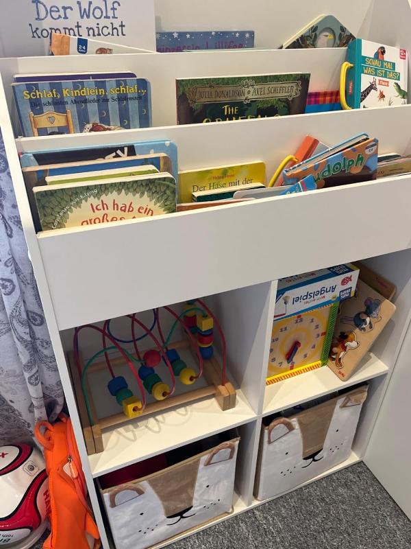 » Ich bin zufrieden, der Aufbau war auch alleine mit kleinen Kind im Raum machbar. Die Stabilität ist super und in die Fächer passen viele Sachen. Es gibt allerdings viele sichtbare Schrauben, auf die so ein kleiner Plastiknöppel gesteckt werden soll. Für Kinder mit Fingerfertigkeit ist die Idee nicht ganz ideal, weil sie leicht wieder abzulösen sind.
