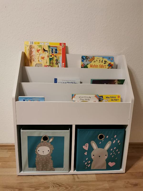 - Das Spielzeugregal für Faltboxen bietet bequeme Aufbewahrungsmöglichkeiten für Bücher und Spielzeug dank drei offener Ablagen und zwei Box-Fächern.