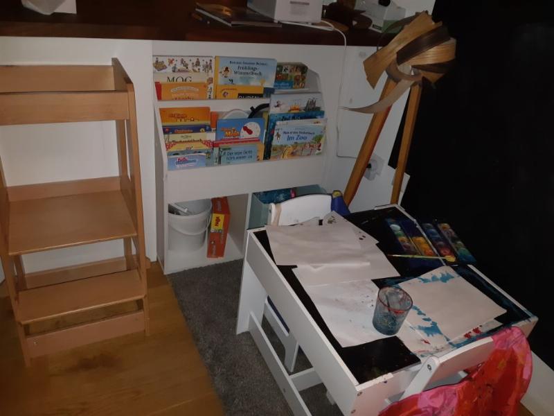 Unten links sind Knetsachen und Puzzel, rechts eine Kiste mit Verkleidung und oben die Bücher.
