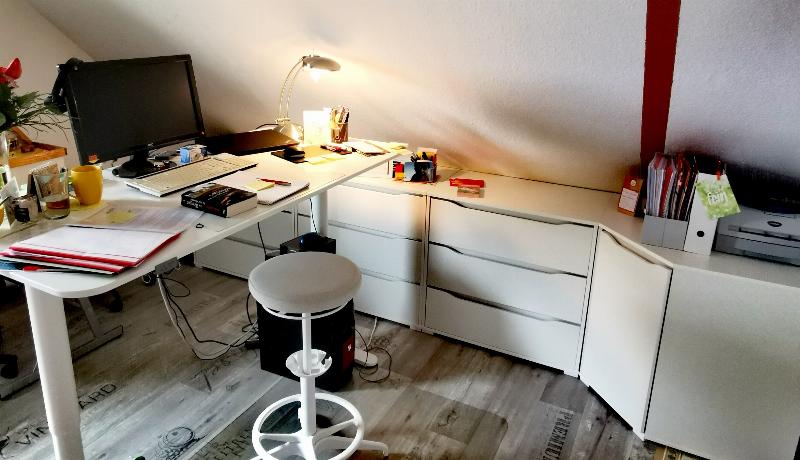 » Ich habe Ihre Möbelelemente als Flachteil unter der Dachschräge angeordnet, wobei der Arbeitsplatz (höhenverstellbarer Schreibtisch) im rechten Winkel steht.