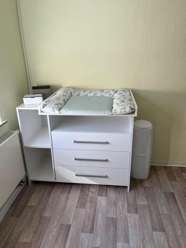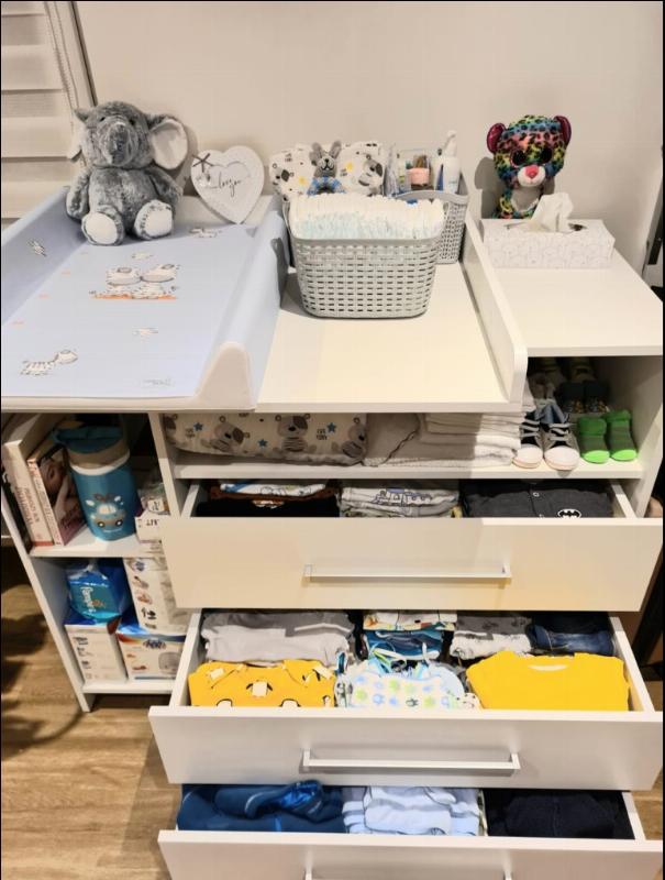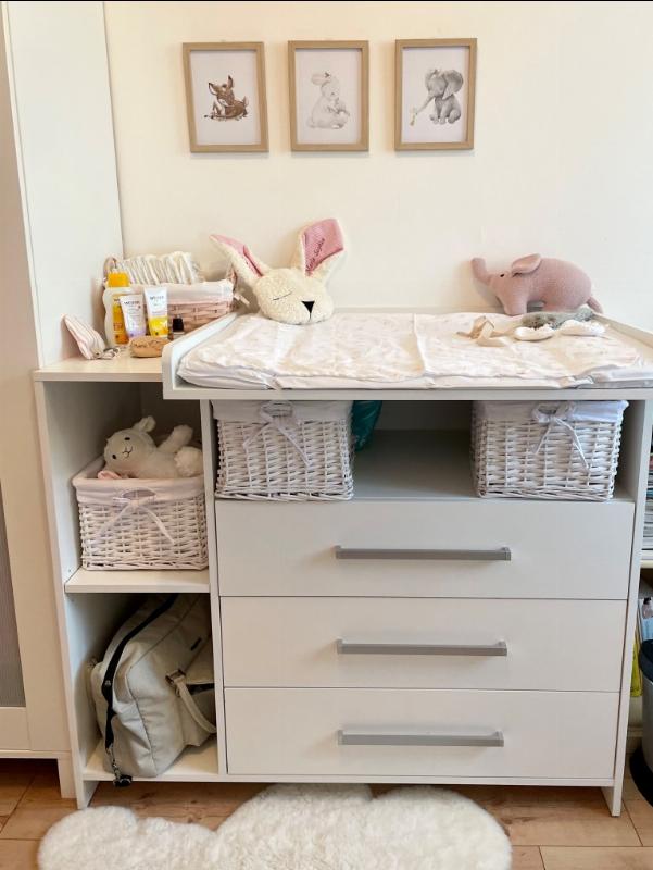 » Der Wickeltisch gefällt uns sehr gut. Wir mögen die Schubladen auf dem Wickeltisch, weil dann die Kleidung des Kindes in Reichweite ist. Uns gefällt, dass es neben der Arbeitsfläche Stauraum gibt. Der Wickeltisch kann später abgenommen und als Wickeltisch verwendet werden. Besonders gut gefallen uns die Seitentaschen auf der linken Seite für Feuchttücher, Wickelauflagen und alles andere, was man für ein Baby braucht. Unter dem Wickeltisch ist die Oberfläche sehr praktisch, wie zu Hause, um Boxen usw. zu benutzen. Der Wickeltisch ist flexibel einstellbar.